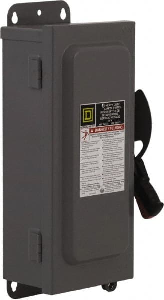 Square D 30 Amp, 240 VAC, 250 VDC, 2 Pole Fused Safety Switch NEMA 12 & 3R, 0.5 hp at 120 VAC, 1.5 hp at 240 VAC, 3 hp at 240 VAC Max (Single Phase), 3 hp at 240 VAC (std) 7.5 hp at 240 VAC (Max) 5 hp at 250VDC (Triple Phase) H221AWK - 69667012