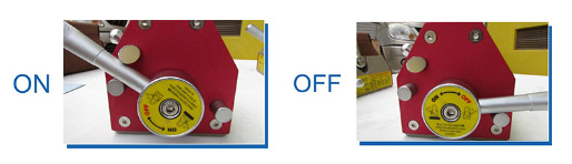 First center the lifting magnet on the material. Then, simply move the lever to the "ON" position to engage the lifting magnet.