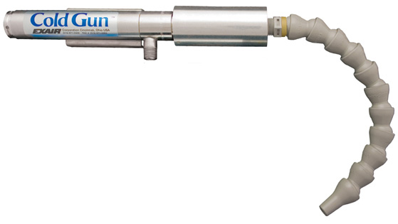The Cold Gun increases tool life, tolerances and production rates by eliminating heat build-up. The quiet Cold Gun produces cold air at 20°F from compressed air to extend tool life, stop burning, and reduce wheel loading. No moving parts assures maintenance-free operation. The Cold Gun is ideal for dry machining or to replace messy mist systems.