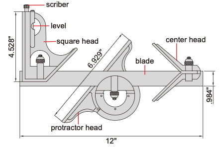 - Protractor head (made of cast iron): set the blade at desired angle to an edge of a workpiece, and can be used to measure angles range: 0-180° accuracy: ±20min