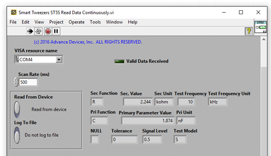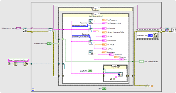Smart Tweezers ST5S-BT LabVIEW® instrument driver allows to seamlessly integrate the LCR meter in the lab environment and use extensive LabVIEW® capabilities for data logging, database storage, charting and passing to the connected equipment.